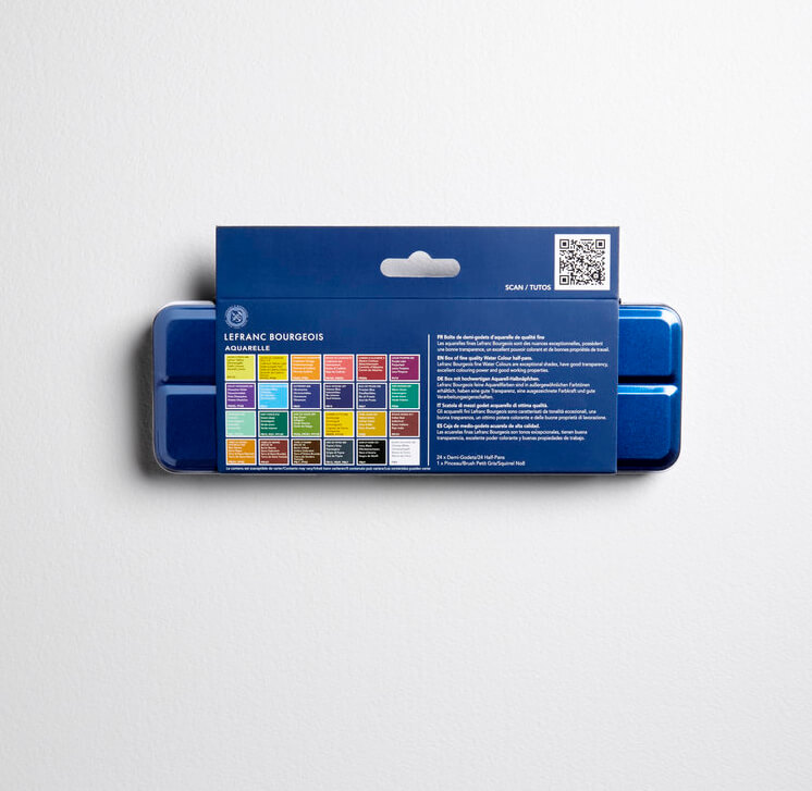 Astuccio in metallo con all’interno 24 mezzi godet ed 1 pennello componibile. Possibilità di estrarre la parte supportante degli acquerelli e usare il resto dell’astuccio come tavolozza dove miscelare i colori.