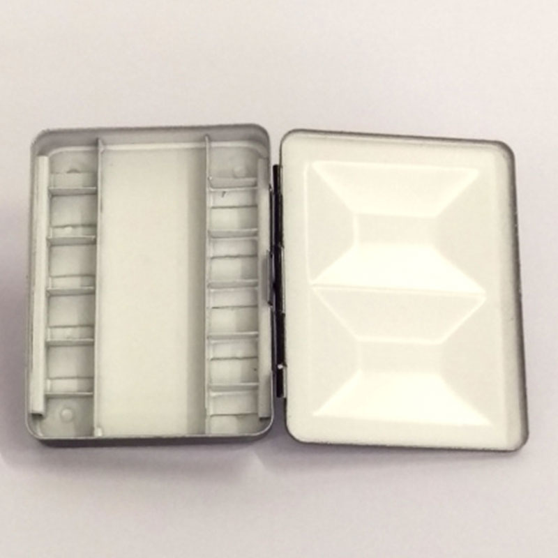 Confezione in metallo vuota, verniciate nero all’esterno e bianco all’interno, contenente 12 spazi da 1 ml di colore