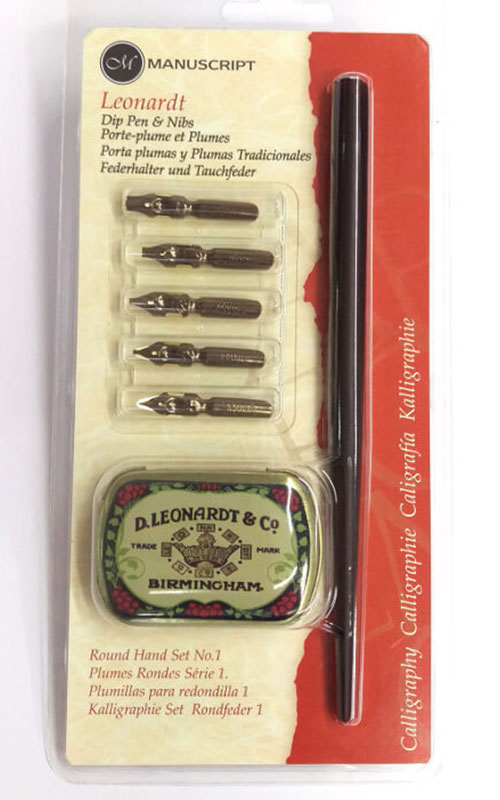 Confezione contenente una penna calligrafica ricaricabile, con pennino in metallo della larghezza di 2,3 mm.
