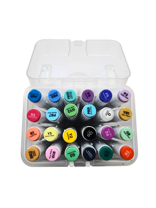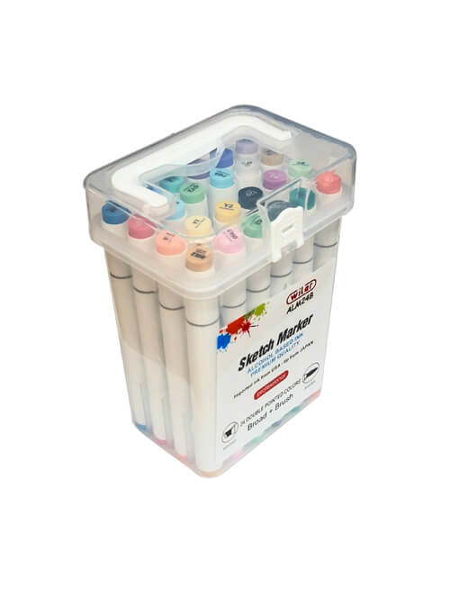 Un astuccio in plastica con all’interno 24 pennarelli, doppia punta a pennello molto morbida e a scalpello più rigida. Inchiostro a base alcool. Ideale per illustrazioni, fumetti e arredo d’interni.