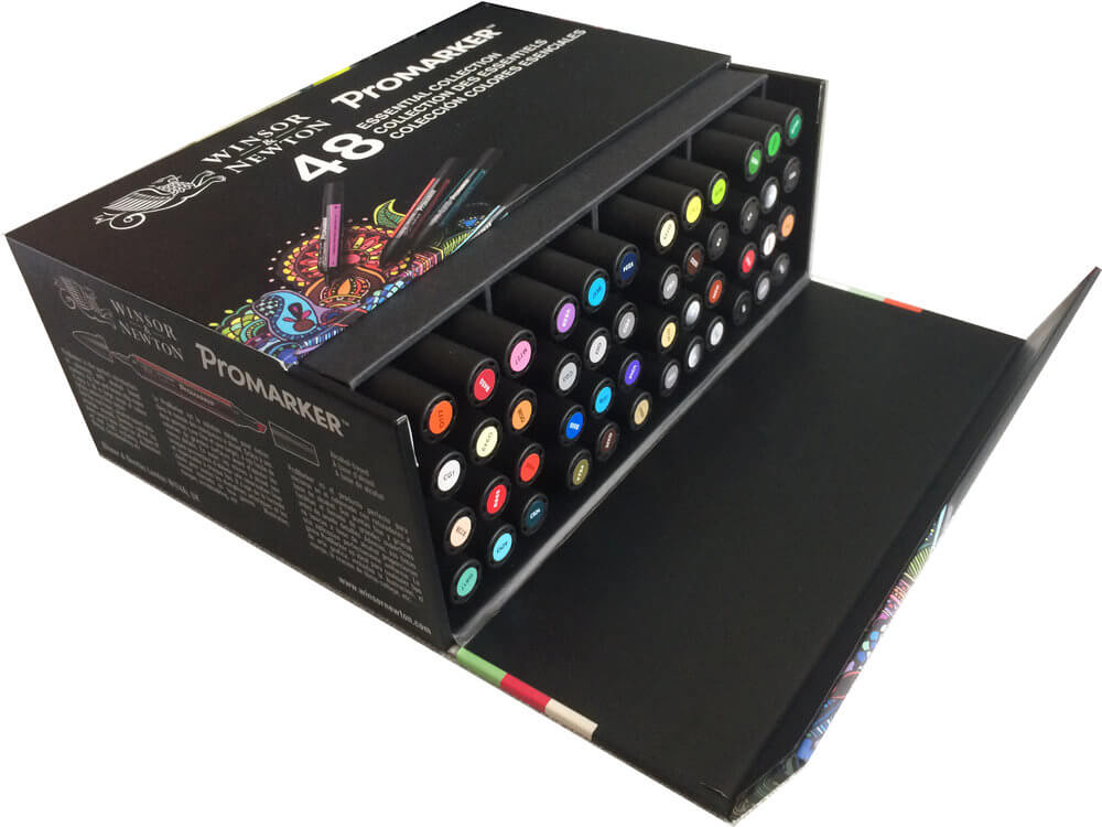 Confezione con 48 pennarelli Promarker in cartone rigido con con chiusura calamitata su pannello frontale.