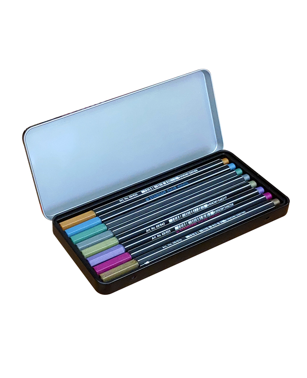 Set 8 pennarelli alloggiati in un astuccio di metallo. Inchiostro a base d’acqua. I pigmenti di alta qualità garantiscono alta resistenza alla luce e lunga durata. Punta in feltro, spessore del tratto di 1,4 mm. Ideale per tutti coloro che desiderano sperimentare o approcciarsi alla tecnica dell’handlettering oppure aggiungere uno speciale tocco metallizato ai propri biglietti, disegni o lavori decorativi. Grande resa su superfici lisce come cartoncino, carta e metallo grazie all’eccellente copertura dei colori metallizzati. Elevata brillantezza e luminosità anche su carta e/o cartoncino scuro.